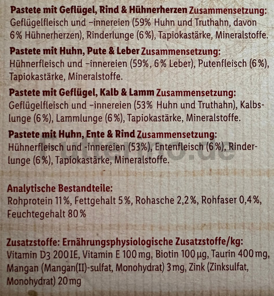 Die Rezeptur kombiniert Geflügel mit Kalb und Lamm als tierische Proteinquellen. Das Futter liefert Taurin, das für Katzen lebensnotwendig ist. Die Rezeptur kommt ohne Zuckerzusatz aus und wird zu einer feinen Pastete verarbeitet. Ein ausgewogenes Alltagsfutter für gesunde Katzen.