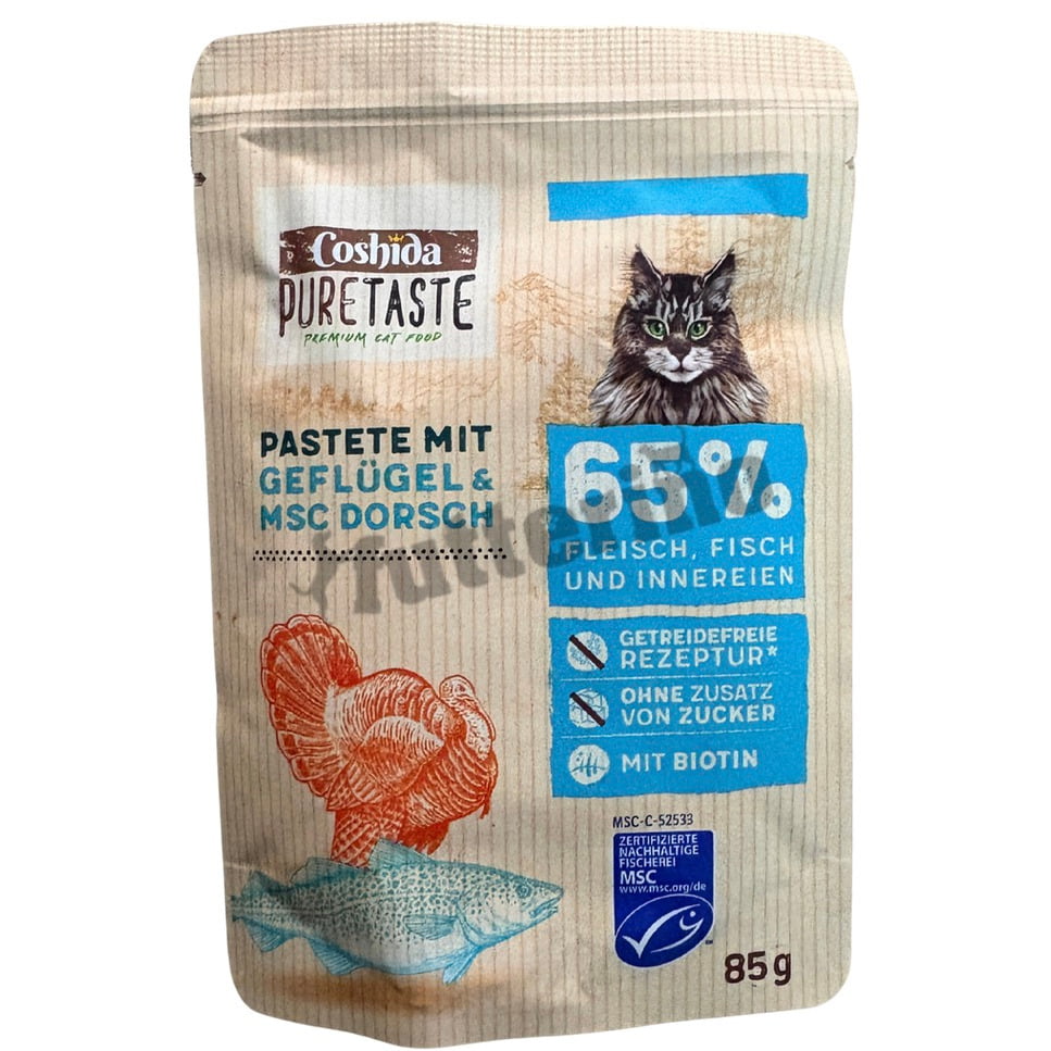 COSHIDA Pure Taste Pastete Geflügel & MSC Dorsch st ein getreidefreies Alleinfuttermittel für ausgewachsene Katzen mit 65 % Fleisch, Fisch und Innereien.