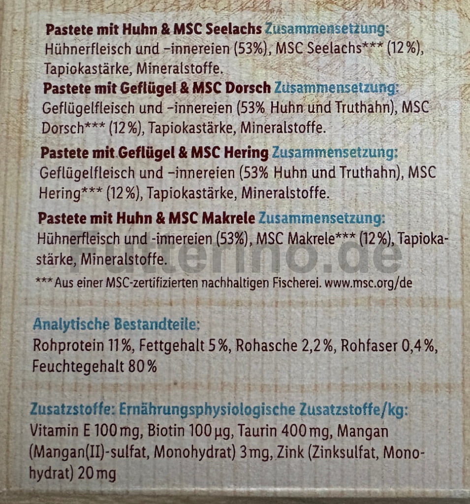 Als tierische Proteinquellen werden Geflügel sowie MSC-zertifizierter Dorsch eingesetzt. Das Futter enthält Taurin und Biotin, verzichtet auf Zuckerzusatz und zugesetzte Öle. Fettsäuren sind natürlicherweise über Fisch und Fleisch enthalten.