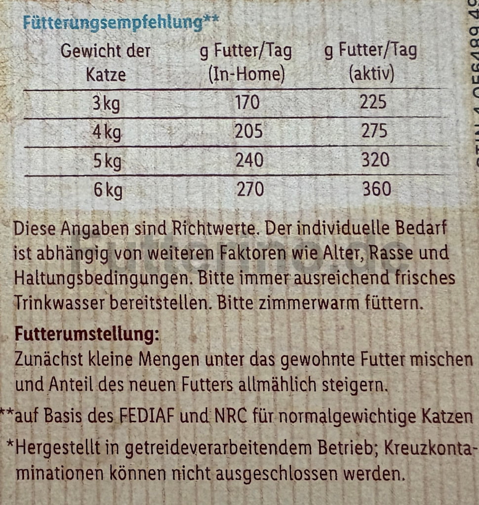 | Gewicht der Katze | Tagesration in g/Tag | |