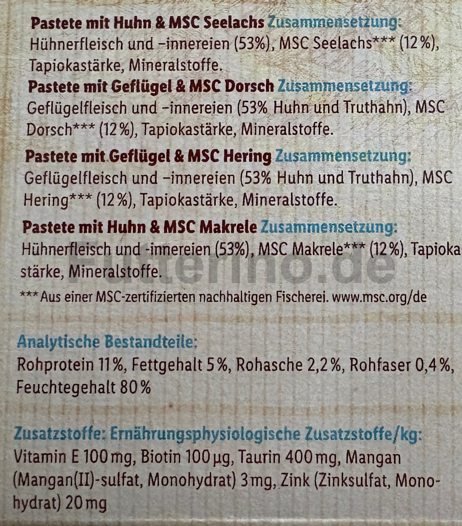 Hühnerfleisch und -innereien (53%), MSC Seelachs*** (12%), Tapiokastärke, Mineralstoffe.
