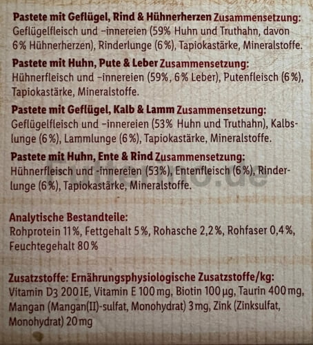 Hühnerfleisch und -innereien (59%, 6% Leber), Putenfleisch (6%), Tapiokastärke, Mineralstoffe.