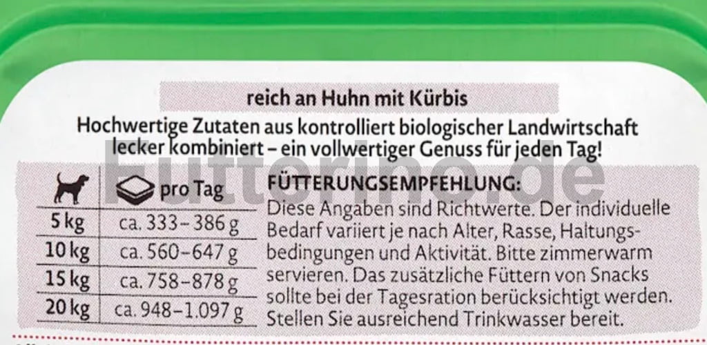 Diese Angaben sind Richtwerte. Der individuelle Bedarf variiert je nach Alter, Rasse, Haltungsbedingungen und Aktivität. Das zusätzliche Füttern von Snacks sollte bei der Tagesration berücksichtigt werden. Ausreichend Trinkwasser immer zur Verfügung stellen.