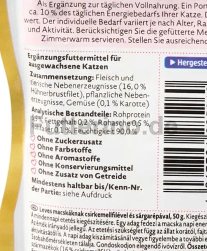 Ergänzungsfuttermittel für Katzen in Form einer feinen Suppe mit Hühnerbrustfilet und Karotte. Ideal als schmackhafte Ergänzung zur täglichen Ernährung und zur Unterstützung der Flüssigkeitsaufnahme.
