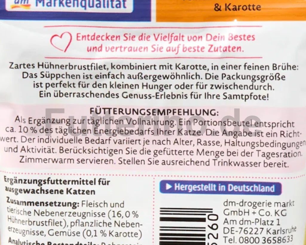 Das „Süppchen“ von Dein Bestes kombiniert zartes Hühnerbrustfilet mit Karotten in einer leichten Brühe und sorgt für ein besonders schmackhaftes Fütterungserlebnis. Durch den hohen Feuchtigkeitsgehalt unterstützt es die Flüssigkeitsaufnahme der Katze und eignet sich perfekt als Ergänzung zur täglichen Vollnahrung.