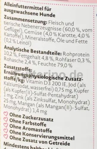 Fleisch und tierische Nebenerzeugnisse (60,0 % vom Geflügel), Gemüse (4,0 % Karotte, 4,0 % Kartoffel), Mineralstoffe, Öle und Fette (0,2 % Leinöl)