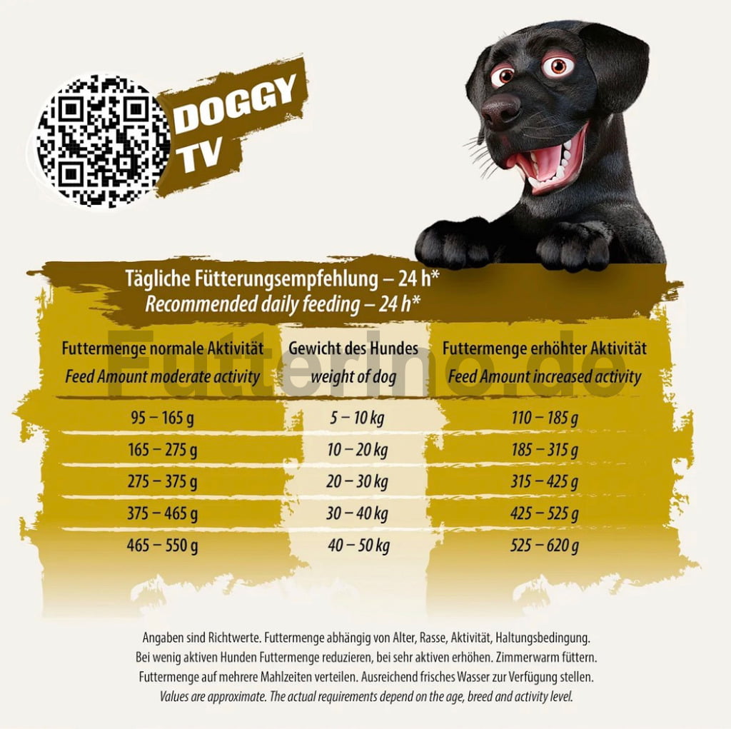 Die angegebene Menge dient nur der Orientierung. Die Futtermenge muss entsprechend dem Alter, der Rasse und der Beanspruchung angepasst werden. Dein Hund sollte stets frisches Wasser zur Verfügung haben.