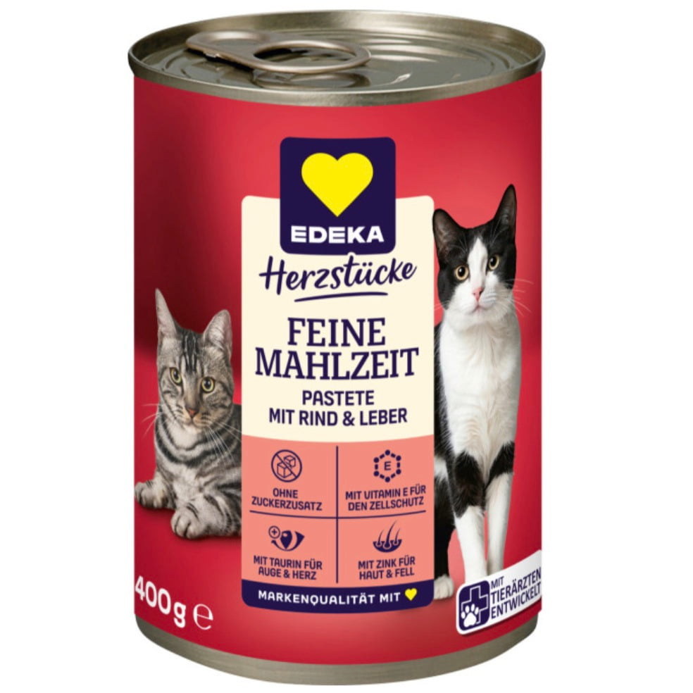 Die feine Pastete mit Rind und Leber aus der EDEKA Herzstücke Linie ist ein schmackhaftes Nassfutter für ausgewachsene Katzen. Die zarte Konsistenz sorgt für eine hohe Akzeptanz, während zugesetztes Taurin sowie Vitamin E und Zink wichtige Körperfunktionen unterstützen.