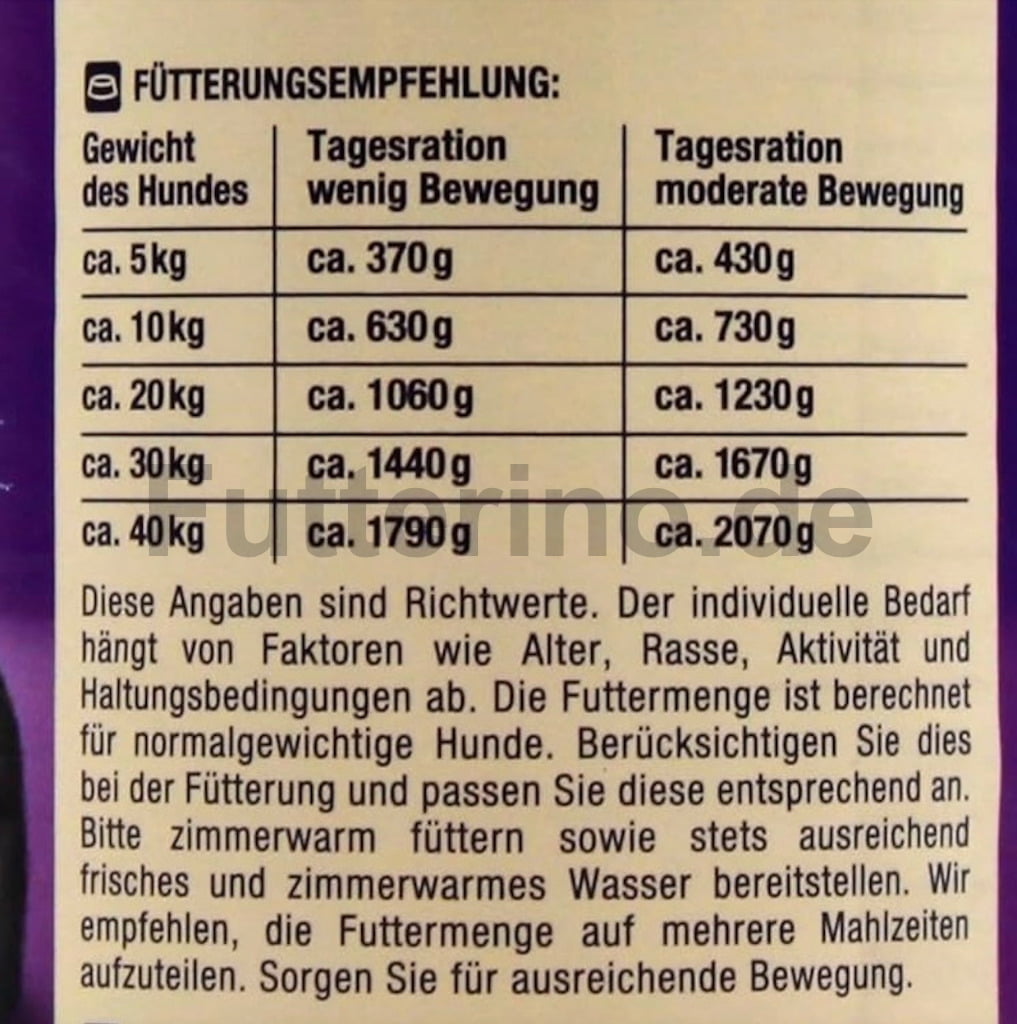 Diese Angaben sind Richtwerte. Der individuelle Bedarf hängt von Faktoren wie Alter, Rasse, Aktivität und Haltungsbedingungen ab. Die Futtermenge ist berechnet für normalgewichtige Hunde. Berücksichtigen Sie dies bei der Fütterung und passen Sie diese entsprechend an. Bitte zimmerwarm füttern sowie stets ausreichend frisches und zimmerwarmes Wasser bereitstellen. Wir empfehlen, die Futtermenge auf mehrere Mahlzeiten aufzuteilen. Sorgen Sie für ausreichende Bewegung.