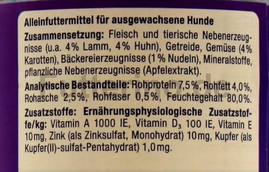 Fleisch und tierische Nebenerzeugnisse (u. a. 4 % Lamm, 4 % Huhn), Getreide, Gemüse (4 % Karotten), Bäckereierzeugnisse (4 % Nudeln), Mineralstoffe, pflanzliche Nebenerzeugnisse (z. B. Apfelextrakt).