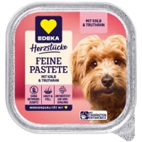 EDEKA Herzstücke Feine Pastete ist ein getreidefreies Nassfutter für ausgewachsene Hunde mit ausgewählten Fleischquellen aus Kalb und Truthahn. Die feine Pastete kommt ohne Zucker-, Farb- oder Konservierungsstoffe aus und kann als vollwertige tägliche Mahlzeit gefüttert werden.