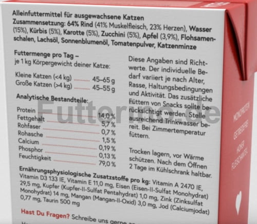 64% Rind* (41% Muskelfleisch, 23% Herzen), Wasser* (15%), Kürbis* (5%), Karotte* (5%), Zucchini* (5%), Apfel* (3,9%), Flohsamenschalen*, Lachsöl*, Sonnenblumenöl*, Tomatenpulver*, Katzenminze*