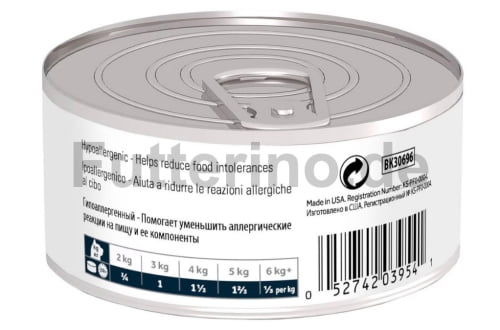Diätetisches Alleinfuttermittel zur Minderung von Ausgangserzeugnis- und Nährstoffintoleranzerscheinungen bei erwachsenen Katzen. Dieses Diätfuttermittel enthält eine ausgewählte Kohlenhydratquelle und eine hydrolysierte Proteinquelle.