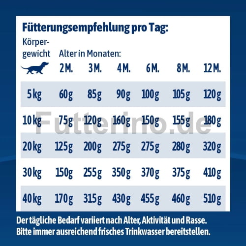 Diese Angaben sind Richtwerte. Der individuelle Bedarf variiert je nach Alter, Rasse, Haltungsbedingungen und Aktivität des Hundes. Bei zusätzlicher Fütterung von Snacks sollte die Tagesration entsprechend angepasst werden. Frisches Trinkwasser sollte jederzeit zur Verfügung stehen.