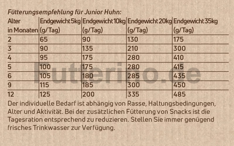 Diese Angaben sind Richtwerte. Der individuelle Bedarf variiert je nach Alter, Rasse, Haltungsbedingungen und Aktivität. Das zusätzliche Füttern von Snacks sollte bei der Tagesration berücksichtigt werden. Ausreichend Trinkwasser immer zur Verfügung stellen.