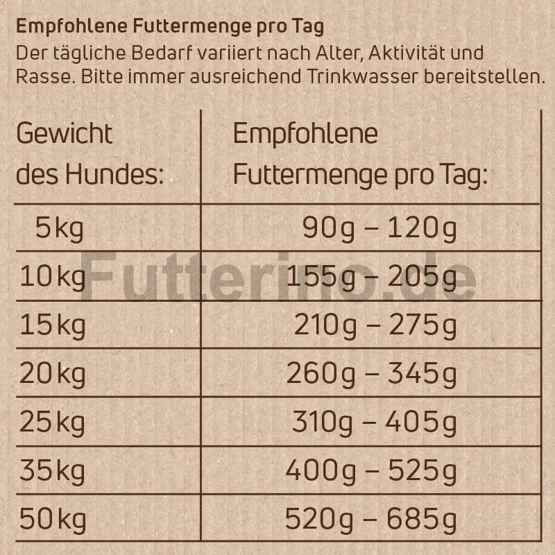 Die angegebene Menge dient nur der Orientierung. Die Futtermenge muss entsprechend dem Alter, der Rasse und der Beanspruchung angepasst werden. Dein Hund sollte stets frisches Wasser zur Verfügung haben.