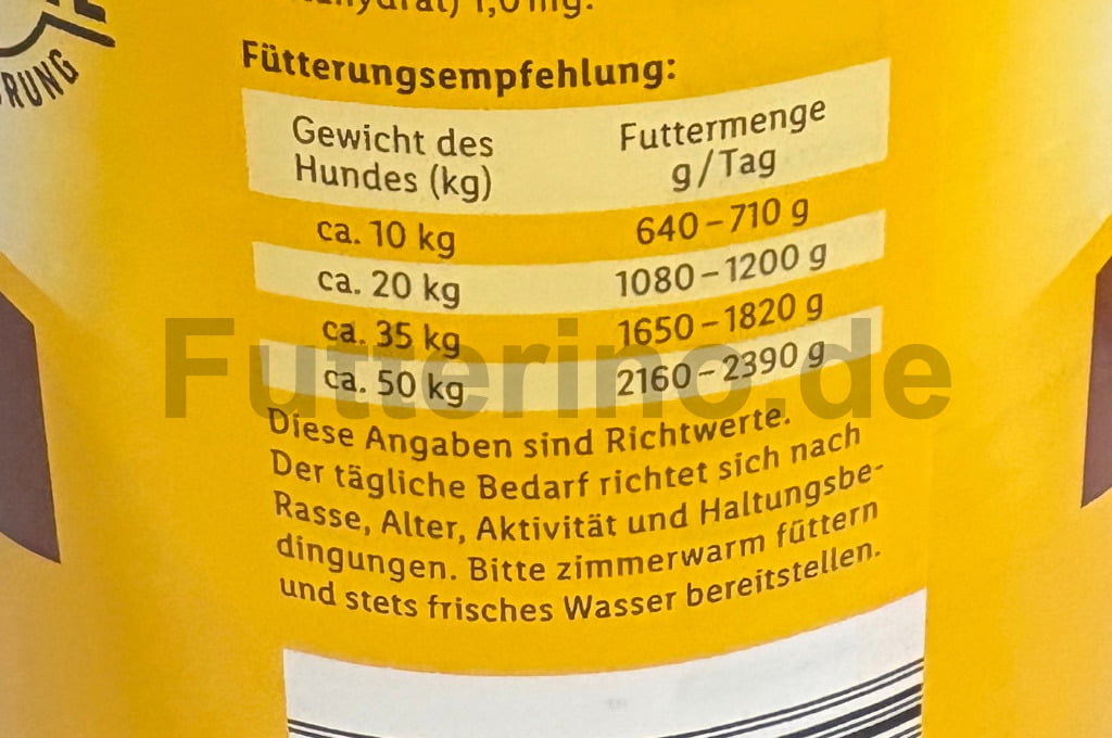 Die angegebene Menge dient nur der Orientierung. Die Futtermenge muss entsprechend dem Alter, der Rasse und der Beanspruchung angepasst werden.