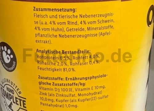 Fleisch und tierische Nebenerzeugnisse (u. a. 4 % vom Rind, 4 % vom Schwein, 4 % vom Huhn), Getreide, Mineralstoffe, pflanzliche Nebenerzeugnisse (Apfelextrakt)