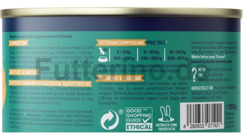 Die Komposition mit Ente bringt ordentlich Aroma in den Napf und liefert eine Extraportion tierisches Protein. Kombiniert mit Kürbis entsteht eine besonders bekömmliche Mahlzeit, die nicht nur gut schmeckt, sondern auch richtig schön sättigt.