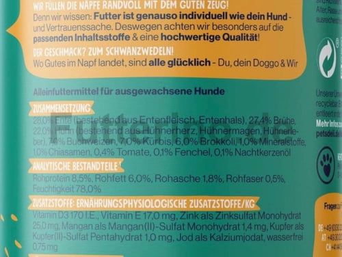 28,0% Ente (bestehend aus Entenfleisch, Entenhals), 27,4% Brühe, 22,0% Huhn (bestehend aus Hühnerherz, Hühnermagen, Hühnerleber), 7,0% Buchweizen, 7,0% Kürbis, 6,0% Brokkoli, 1% Mineralstoffe, 1,0% Chiasamen, 0,4% Tomate, 0,1% Fenchel, 0,1% Nachtkerzenöl