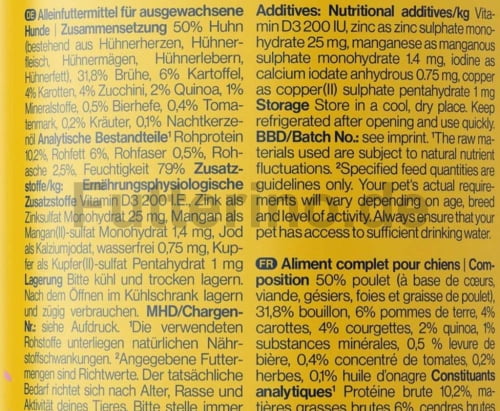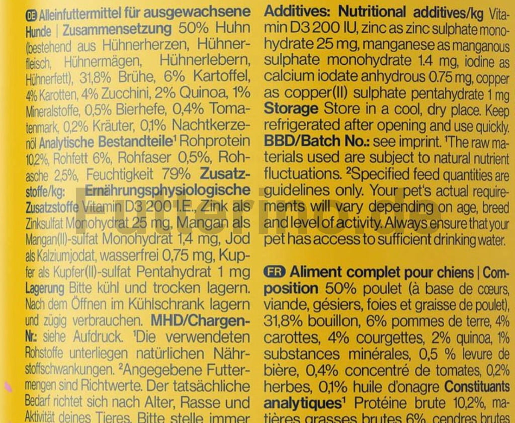 50,0% Huhn (bestehend aus Hühnerherzen, Hühnerfleisch, Hühnermägen, Hühnerlebern, Hühnerfett), 31,8% Brühe, 6,0% Kartoffel, 4,0% Karotten, 4,0% Zucchini, 2,0% Quinoa, 1,0% Mineralstoffe, 0,5% Bierhefe, 0,4% Tomatenmark, 0,2% Kräuter, 0,1% Nachtkerzenöl