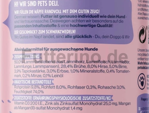 50,0% Lamm (bestehend aus Lammherz, Lammfleisch, Lammleber, Lammlunge, Lammpansen), 28,4% Brühe, 8,0% Hirse, 5,0% Birne, 3,9% Tapiokastärke, 3,0% Erbse, 1,0% Mineralstoffe, 0,4% Tomatenmark, 0,2% Minze, 0,1% Leinöl