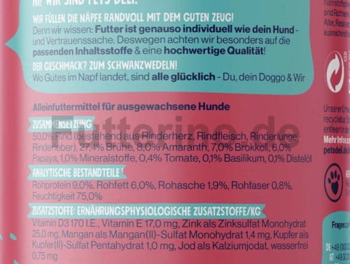 50,0% Rind (bestehend aus Rinderherz, Rindfleisch, Rinderlunge, Rinderleber), 27,4% Brühe, 8,0% Amaranth, 7,0% Brokkoli, 6,0% Papaya, Mineralstoffe, 0,4% Tomate, 0,1% Basilikum, 0,1% Distelöl