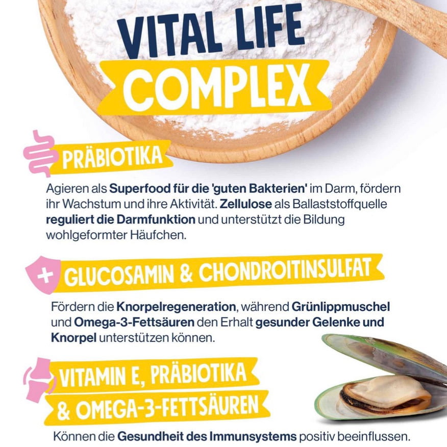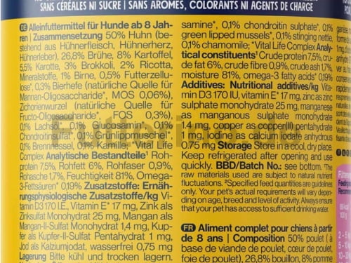 Die Geheimzutat: Der innovative Vital Life Complex! Speziell für ältere Hunde entwickelt, enthält er wertvolle Präbiotika, die nicht nur die Darmgesundheit fördern, sondern auch das Immunsystem stärken können. Hochwertiges Huhn ist besonders schonend für den Magen und liefert wertvolle Proteine und Energie für einen aktiven Tag. Die enthaltene Kartoffel ist glutenfrei, gut bekömmlich und eine ideale pflanzliche Beilage – besonders für sensible Hundemägen. Für den letzten Schliff sorgen cremiger Ricotta, saftige Birne sowie leckere Karotte. Beide Obst- und Gemüsesorten sind reich an Ballaststoffen und unterstützen so die Darmgesundheit deines Doggos.