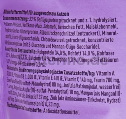33% Geflügelprotein getrocknet und z.T. hydrolysiert, Vollkorn-Weizen, Vollkorn-Mais, Sojamehl, tierisches Fett, Maisklebermehl, hydrolysiertes Hühnerprotein, Rübentrockenschnitzel (entzuckert), Mineralstoffe, Fructo-Oligosaccharide, Chicoréewurzel getrocknet, konzentrierte Hefenerzeugnisse (mit 0,025% ß-Glucanen und 0,02% Mannan-Oligo-Saccharide).