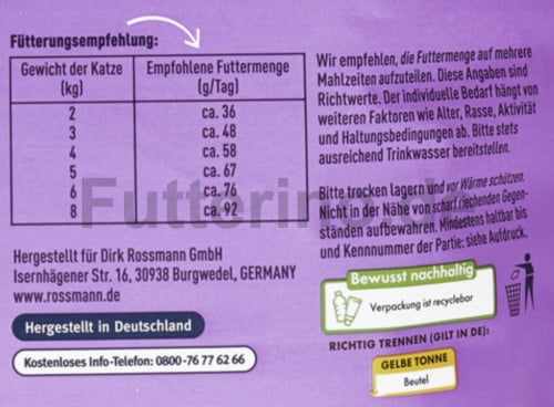 Die angegebene Menge dient nur der Orientierung. Die Futtermenge muss entsprechend dem Alter, der Rasse und der Beanspruchung angepasst werden. Deine Katze sollte stets frisches Wasser zur Verfügung haben.