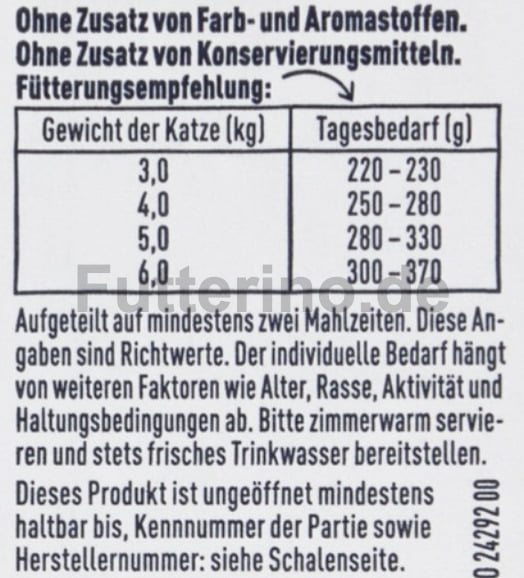 Aufgeteilt auf mindestens zwei Mahlzeiten. Diese Angaben sind Richtwerte. Der individuelle Bedarf hängt von weiteren Faktoren wie Alter, Rasse, Aktivität und Haltungsbedingungen ab. Bitte zimmerwarm servieren und stets frisches Trinkwasser bereitstellen.