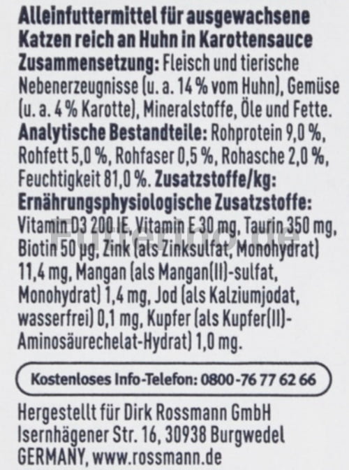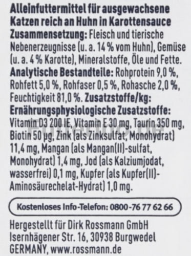 Die Rezeptur enthält essentielle Nährstoffe wie Taurin – wichtig für Herz- und Augenfunktionen – sowie Vitamine und Mineralstoffe, die zu einer ausgewogenen Versorgung beitragen. Dieses Nassfutter richtet sich an ausgewachsene Katzen. Die feuchte Konsistenz erleichtert das Fressen und unterstützt gleichzeitig die Flüssigkeitsaufnahme.