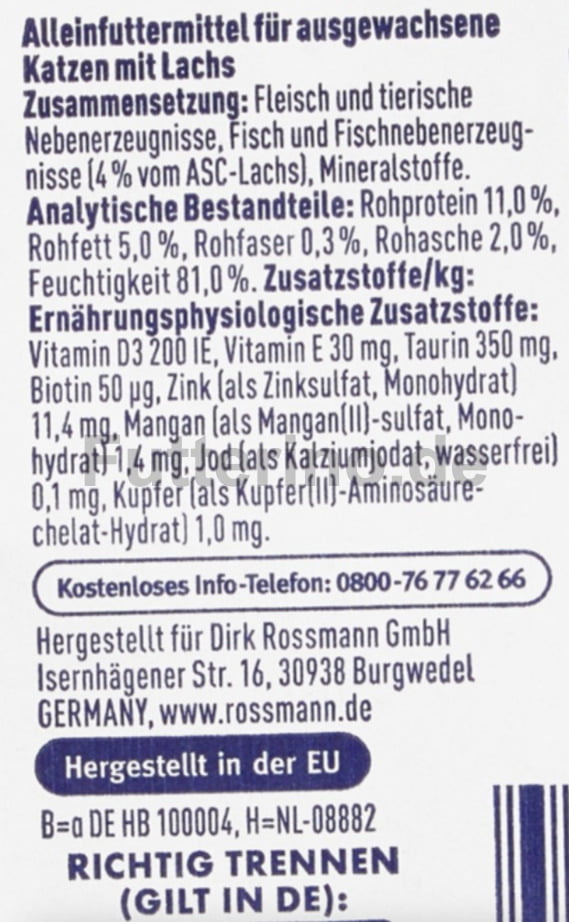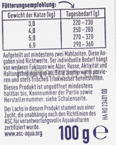 Dieses Nassfutter richtet sich an ausgewachsene Katzen und basiert auf einer Rezeptur mit Fleisch und tierischen Nebenerzeugnissen, darunter eindeutig Lachs. Es enthält wichtige Nährstoffe wie Taurin, Vitamine und Mineralstoffe und kommt ohne Zucker, Konservierungs-, Farb- oder Aromastoffe aus.