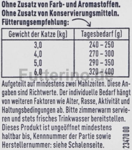 Aufgeteilt auf mindestens zwei Mahlzeiten. Diese Angaben sind Richtwerte. Der individuelle Bedarf hängt von weiteren Faktoren wie Alter, Rasse, Aktivität und Haltungsbedingungen ab. Bitte zimmerwarm servieren und stets frisches Trinkwasser bereitstellen.