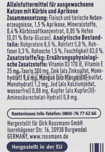 Dieses Alleinfuttermittel kombiniert Fleisch und tierische Nebenerzeugnisse mit 1,5 % Aprikose sowie 0,4 % Kürbissaftkonzentrat. Zusätzlich enthält es 0,05 % Hefe (davon 0,01 % Beta-Glucan). Der Feuchtigkeitsgehalt von 83 % unterstützt die Flüssigkeitsaufnahme. Enthaltene Vitamine, Taurin und Spurenelemente tragen zur täglichen Nährstoffversorgung ausgewachsener Katzen bei.