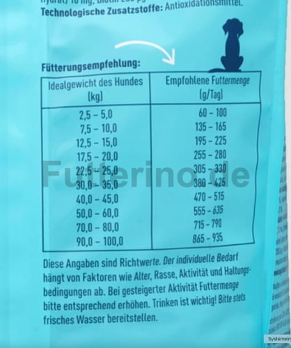 Die angegebene Menge dient nur der Orientierung. Die Futtermenge muss entsprechend dem Alter, der Rasse und der Beanspruchung angepasst werden. Dein Hund sollte stets frisches Wasser zur Verfügung haben.
