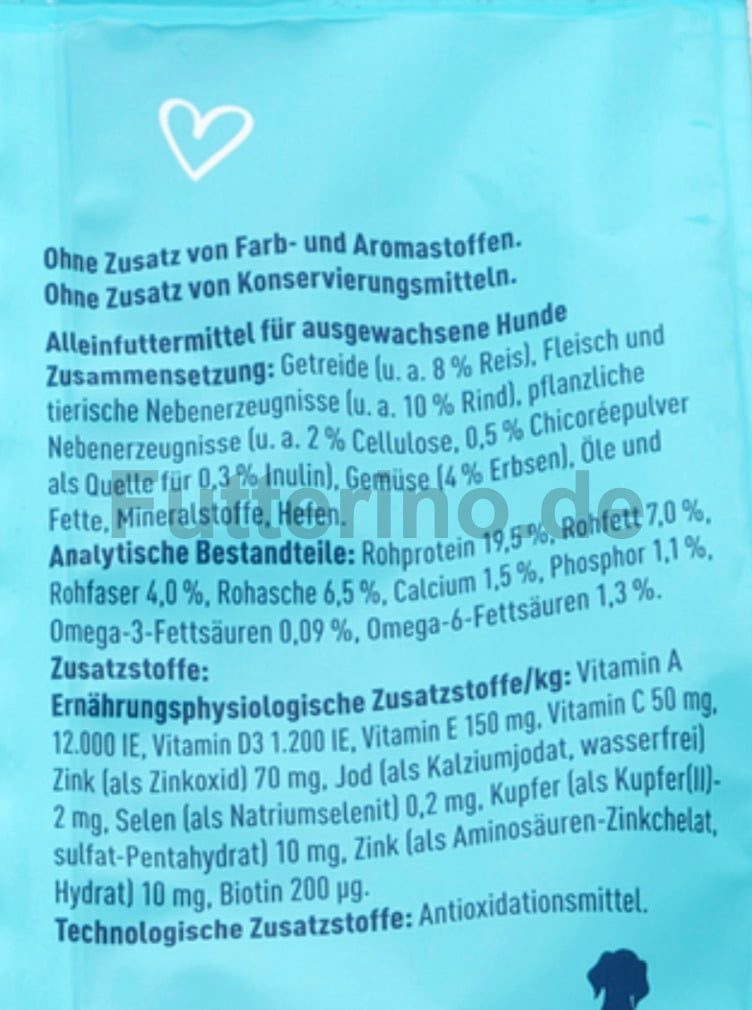 Getreide (u. a. 8 % Reis), Fleisch und tierische Nebenerzeugnisse (u. a. 10 % Rind), pflanzliche Nebenerzeugnisse (u. a. 2 % Cellulose, 0,5 % Chicorée als Quelle für 0,3 % Inulin), Gemüse (4 % Erbsen), Öle und Fette, Mineralstoffe, Hefen