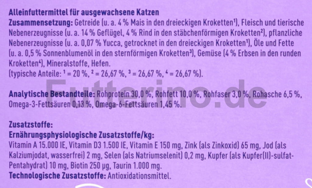 Getreide (u.a. 4 % Mais in den dreieckigen Kroketten1), Fleisch und tierische Nebenerzeugnisse (u.a. 14 % Geflügel, 4% Rind in den stäbchenförmigen Kroketten2), pflanzliche Nebenerzeugnisse (u.a. 0,07 % Yucca, getrocknet in der dreieckigen Krokette1), Öle und Fette (u.a. 0,5 % Sonnenblumenöl in den sternförmigen Kroketten3), Gemüse (4 % Erbsen in den runden Kroketten4), Mineralstoffe, Hefen. (typische Anteile: 1=20 %, 2 = 26,67 %, 3 = 26,67%, 4 = 26,67 %)