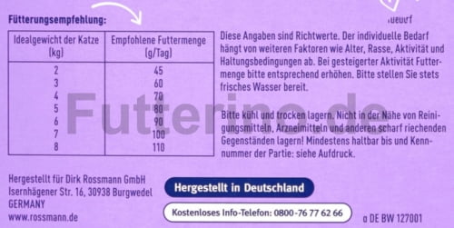 Die angegebene Menge dient nur der Orientierung. Die Futtermenge muss entsprechend dem Alter, der Rasse und der Beanspruchung angepasst werden. Deine Katze sollte stets frisches Wasser zur Verfügung haben.