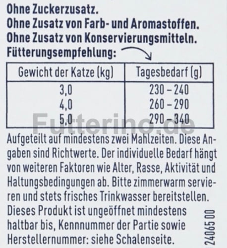 Aufgeteilt auf mindestens zwei Mahlzeiten.Diese Angaben sind Richtwerte. Der individuelle Bedarf hängt von weiteren Faktoren wie Alter, Rasse, Aktivität und Haltungsbedingungen ab. Bitte zimmerwarm servieren und stets frisches Trinkwasser bereitstellen.
