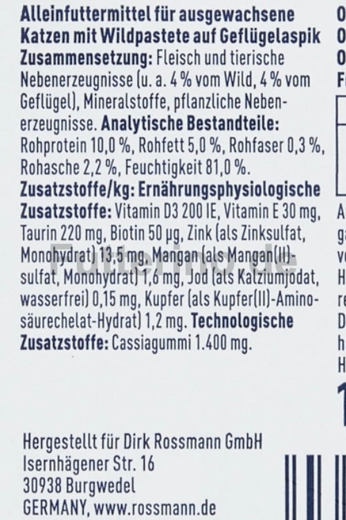 Dieses Nassfutter richtet sich an ausgewachsene Katzen und basiert auf einer Rezeptur mit Wild und Geflügel. Es wird in Form einer Pastete serviert, die von einem klaren Aspik umgeben ist, was die Konsistenz feucht und leicht verdaulich macht. Der hohe Wasseranteil unterstützt gleichzeitig die Flüssigkeitsaufnahme.