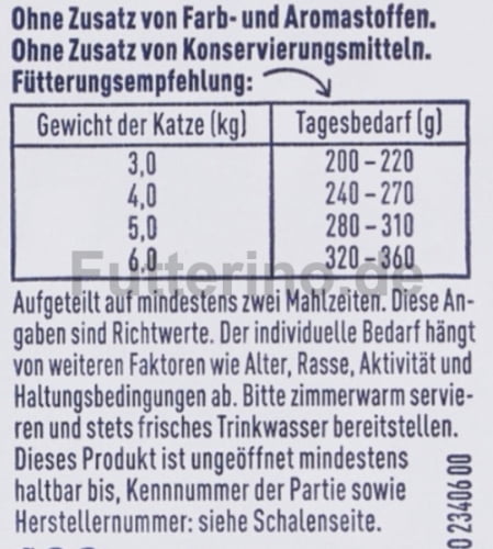 Aufgeteilt auf mindestens zwei Mahlzeiten. Diese Angaben sind Richtwerte. Der individuelle Bedarf hängt von weiteren Faktoren wie Alter, Rasse, Aktivität und Haltungsbedingungen ab. Bitte zimmerwarm servieren und stets frisches Trinkwasser bereitstellen und sorgen Sie für die Möglichkeit von ausreichend Bewegung.