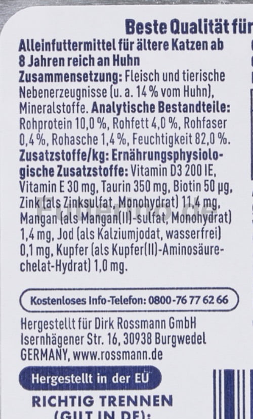 Dieses Nassfutter richtet sich speziell an ältere Katzen und basiert auf einer Mischung aus tierischen Zutaten, darunter Huhn. Die Rezeptur kommt ohne Zuckerzusatz, Farb- oder Aromastoffe und ohne Konservierungsstoffe aus. Enthaltene Nährstoffe wie Taurin unterstützen Funktionen wie Herz-, Augen- und Stoffwechselprozesse. Ergänzend tragen Vitamine und Mineralstoffe zu einer ausgewogenen Versorgung bei.